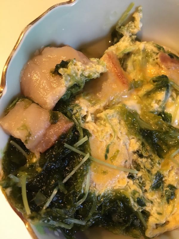 青空レストランで水菜と麩の卵とじを見て食べたいーーーーってなりまして麩を初めて買いましたそして記憶朧ながら、そこはもういつもの通り適当に作りましたもちろん麩を初めて買うぐらいですから初挑戦です水菜がないのでシャキシャキ感が同じだろうと豆苗でそれと冷凍庫で随分前からちびちび使い続けて残ってしまっていたアオサをぶっ込み確かテレビではたっぷりの出汁で煮ていたと記憶していたので粉末出汁多めに入れて、お酒もみりんも適当〜ちょっと味が薄い気がしたのでお塩追加で水は適当に入れたら多くなってしまったので卵は3個ぶっ込み。。。完成しました味見。。。う、うまいっ!うまいやん適当に作ったのに!ちょっと味が濃くなってしまったけど初めてにしては上出来なんちゃうのアオサが香りが良くていい仕事しとる!なんていうかお上品な仕上がりになっとる!!!家族からは何の評価もありませんでしたが自画自賛ですよ多めにできたので残りは翌朝ご飯にかけて食べました