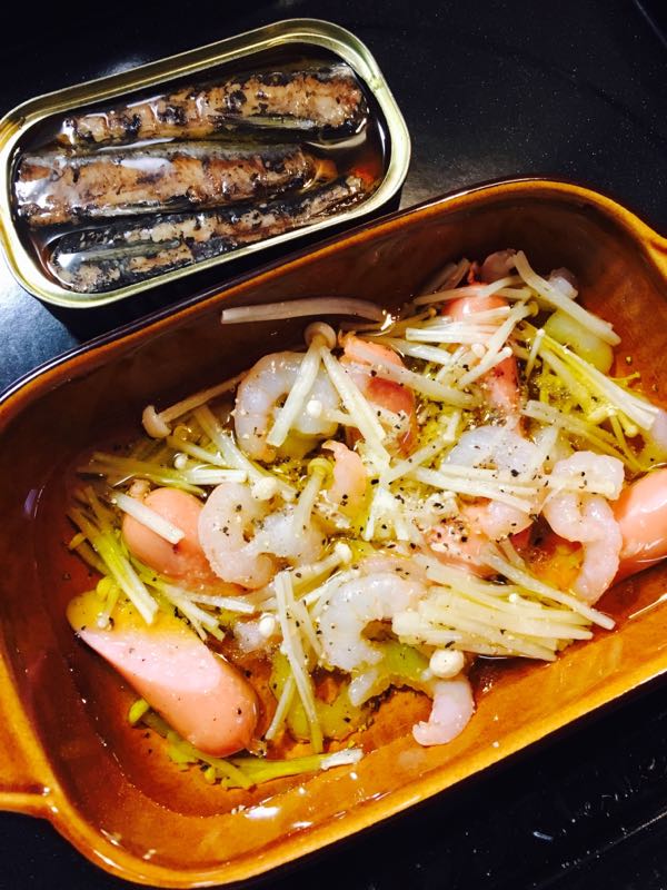 大量のニンニク消費のために〜 冷凍のエビを解凍してエノキとウインナーも入れて 塩胡椒して、オリーブオイルをひたひたになるまで入れて 180度のオーブンで20分 ついでにオイルサーディンもぶっこんでー ダイソーのオイルサーディン 美味しいです もうちょっと長めにオーブン入れた方が良かったかもしれません バゲットもたっぷり準備しまして 満腹満足でした 今度はもうちょっと時間長めにオーブン入れてやろー