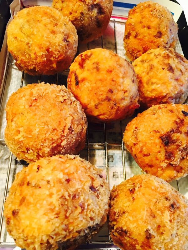 冷凍ご飯のストックが増えてきたのでライスコロッケをいつもは焼き飯にするところですがいつも焼き飯にしてしまうので休みの日ぐらい揚げ物でもしようかと思いましてしかし、以前にライスコロッケを作ったのははるか遠く独身の頃(笑)まあ味が変になるものは何一つ入っていないので大丈夫でしょう合挽き肉とみじん切りの玉ねぎを塩コショウで炒めておいて冷凍ご飯をチンしてケチャップ入れて混ぜ混ぜして団子状にして真ん中にとろけるチーズ入れてフライにしただけです正しい作り方とか知りませんので適当しかも作り始めてからチーズがちょっとしかないことパン粉が後ちょびっとしかないことが発覚!チーズ入りとチーズなしができてしまいましたそしてパン粉をケチって使いさらに足りない分は小麦粉で補いました料理は計画的に〜ま、グルメでない我が家の男たちの腹に入るものなので高カロリーな揚げ物ってだけで喜ばれるだろうしいっか〜