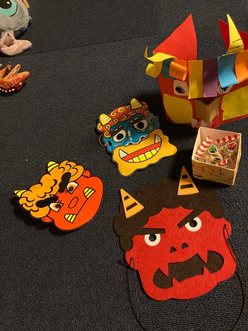 昨日、帰宅してみたら夜勤の夫が見事にサラダ巻だけを2本食べていました私のメモ書きはガン無視ですなんのためのメモ書きか。。。サラダ巻にはウインナーが入っていて、それを楽しみにしていた長男大泣き。キッチンマットに突っ伏して大泣き。。。バカ父ちゃんめ。で、普通巻を子供たちは半分に切ってあげたのですがお気にめしたようで結局切ったやつも含めて1本分以上食べました長男「僕が青組さんの時は失敗したね」だそうです私覚えてないですがきっと去年のブログに味を失敗したかご飯の量を失敗したか、何らかの失敗が書かれているでしょうかーちゃんは忘れてますが子供の記憶力はすごいなそして長男「本当は明日(2/3)が節分なんやろ。明日サッカー(の日)やから神様が今日にしてくれたんかな」やって(笑)可愛いかよ!小学生になり、鬼が来たり豆をまいたりという行事が保育園のようには無くなったのですごく豆まきを楽しみにしていた長男夫が夜勤でいないので今年は私が鬼です顔にお面をつけただけで、低い声で子供らを追いかけたのですがそれはそれは嬉しそうな長男(笑)日頃の恨みか?「めっちゃ楽しい!パパの鬼より楽しい!もっとやりたい!」楽しそうでよかった掃除が楽なように小袋に入った豆を投げさせていましたが投げた豆の袋を踏んで弾けてしまい、結果大惨事。。。長男はこぼれた豆を貪り食う(笑)今年は5歳以下の子は豆を食べてはいけないと園でも厳しく言われた次男の顔と言ったら(笑)食べたいけど食べられないし、「食べたらあかんもん」と豆を握りしめ(笑)食いしん坊の次男は食べたくて、お兄ちゃんが羨ましくてでも食べたらあかんって言われてるしで葛藤がもう顔に出まくって笑えましたよく噛んで少しずつなら食べていいよというと恐々食べてました長男も次男も歳の数なんて関係ない数を食べてました禁じられると余計に食べたくなるのか。豆の味がお気に召したのか。今朝も朝食後に豆を美味しそうに食べる次男。豆の形がウルトラマンに見えるようで、一粒ひと粒食べる前にチェックして「ママみてー!ウルトラマン!」とご報告ですみないと怒られる。。。早くコロナが落ち着いて暖かくなって、お出かけできる日が来るといいな〜。。。コロナ鬼は外〜