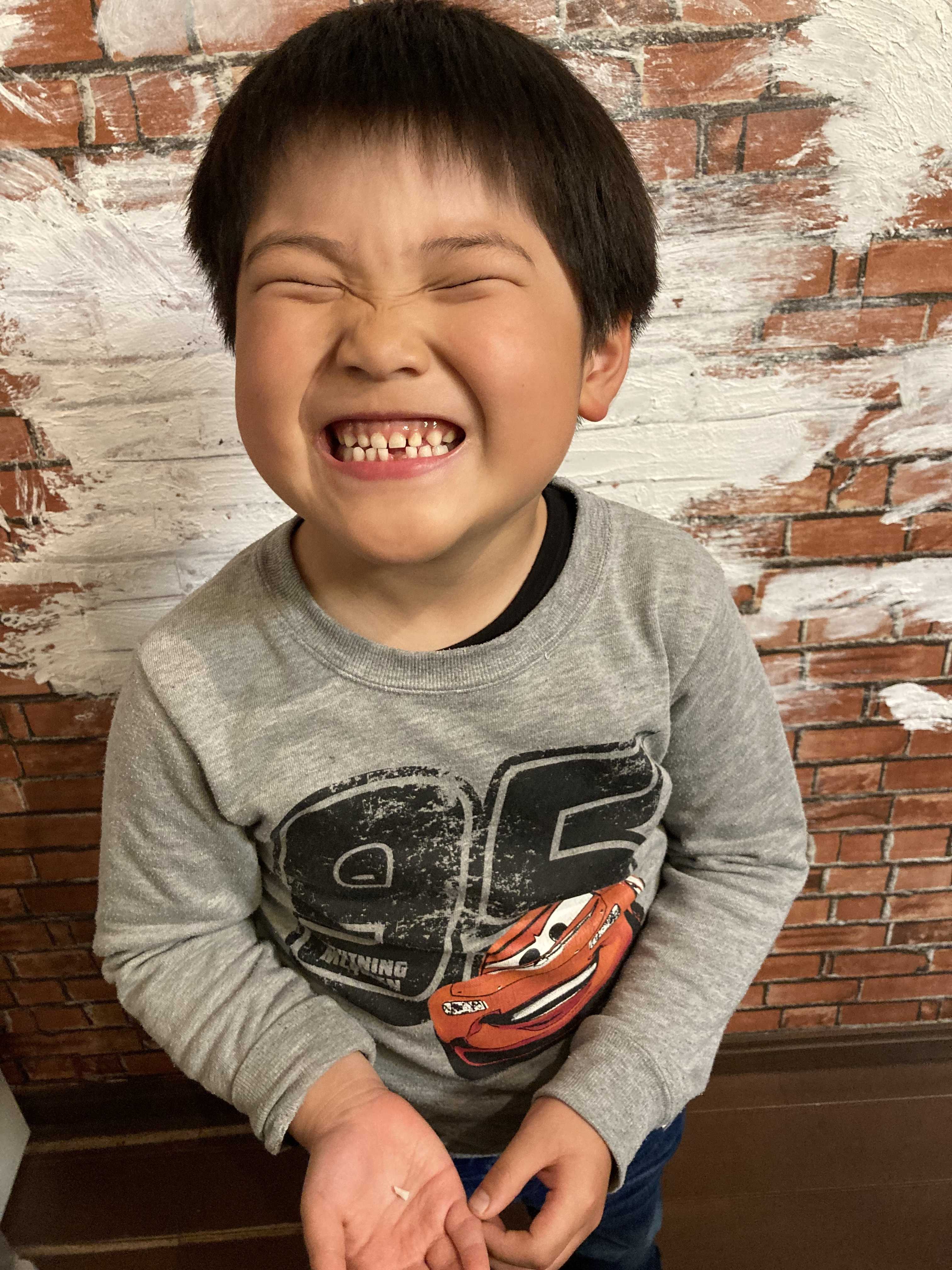 次男の乳歯が抜けました二人目は早く感じますが、実際早かった。このブログに書いた記憶があったので記事を探してみたら長男が6歳1か月で初めての抜歯次男は現在5歳7か月ですそういえば次男は歯が生えるのが早かったな~長男も次男もびびってグラグラから抜けるまですごく時間がかかりましたが次男は長男にもましてビビりで、絶対に抜かせてくれませんでしたもう永久歯がこんにちわって顔を出してるので早く抜いたほうがいいのに。。。で、昨夜、「ママ抜けたー」と見せに来てくれましたいつもは月曜の朝は登園を渋るそぶりをみせる次男ですが今日ばかりはみんなに言いたいようで「今日保育園?」と珍しく食い気味に聞いてきました(笑)登園後、早速先生たちに片っ端から歯が抜けたことを報告する次男(笑)面白すぎる。