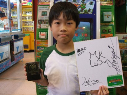 16時からムシスタにおいてセガワールドカップ恐竜大会決勝が行われました。5店舗で行われた予選大会を勝ち抜いた14組(2組は欠場)で戦われ,見事優勝に輝いたのは,(左から)ケイスケ君,ヒデトシ君,ヤスヒロ君の仲良しトリオでした。おめでとうございます!最終予選で決勝大会への切符を手にしたのですが,それだけにまだトリオとしての試合感がホットで,それぞれの持分を,予選大会同様遺憾なく発揮できていました。ムシでもそれぞれがスーパーGCですので,2人抜きや3人抜きでもやっちゃいそうな3人。そんな3人が組んだら,6人がかりで立ち向かわないと叶わないかも知れませんね(^^;)。注目のリュウタカードですが・・・3人とも「炎」・・・結局ワールドカップは予選から決勝まですべて「炎」でした。優勝したトリオは「炎」を2枚ずつもらったことになります。ヤスヒロ君はこれで5回目の優勝ですが,すべて「炎」・・・。レックスカードも追加になるというのに,この偏りはちょっとツライですね(^^;)。また今回の決勝進出者にはムシスタ旧リーダー「ヒーロー」,新リーダー「マスピー」,函館ムシスタリーダー「マック」のサイン色紙をもらったのですが,優勝者にはその3人に加え,ジョニーのサインが入った色紙をもらいました。ちなみのうちのトリオ,33回目の恐竜大会だったわけですが,私と息子のトリオは1回戦で,嫁さんのトリオは決勝で,この優勝トリオに負けました(^^;)。両トリオとも粘ったのですが,ケイスケ君,ヒデトシ君に大将まで引きずり出され,こっちが相手大将ヤスヒロ君を引っ張り出したときはこちらレッド。簡単に仕留められるという同じような展開で負けました。ワールドカップの前,14時から32回目の恐竜大会がありましたが,2回戦で息子は相手をあと一発で倒せるところまで追い込んで2頭目をスキャンするという場面で,当然相手が出してくる勇気手に必殺のボタンを1回も押せずなんとも情けない逆転負けでした。気持ちが高ぶってクールダウンする必要があったため,大会後クールダウンムシ連コ(^^;)。ムシスタでアダーリッキー,帰りに寄ったジャスコでギラファを出しました。クールダウンどころか,よけい熱くなったかも(笑)。
