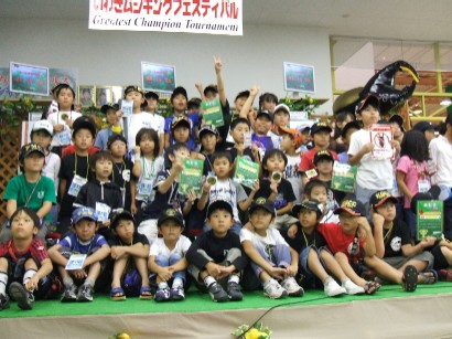 朝4時過ぎまで飲んでいて,仮眠室で寝たと思ったらすぐにパラワンさんに声をかけられ目が覚めました。数分しか寝ていないと思ったら,2時間は寝ていたようです(^^;)。IMFのスタッフは早くに集合ということで,パラワンさんが早出なので会場まではまーくんパパが送ってくれることになりました。大会前日,親がムシ談義に花をさかせている横で,息子をはじめ数人の子供が夜更かししていたわけですが,早く寝たかどうかがムシフェスでの結果で明暗を分けることになろうとは,このとき誰も判っていませんでした・・・。会場に着くと,当日入りする全国各地のプレイヤーがたくさん集まっていました。挨拶をしながら,息子も受付を済まし,開場を待ちました。開場前,IMTの保護者と子供たちが一列に並んで向かい合い,子供たちが保護者に,今回のフェスへの尽力について,お礼を述べました。次に子供たちは180度向きを変えて,全国から来た皆さんに,挨拶をしてくれました。さすが体育系のIMTだけあるなと感心いたしました(^^)。礼にはじまり礼に終わる・・・。開場し,会長にとって思い入れがあるBGMが流れる中,ついに「いわきムシキングフェスティバル」がスタートしました。IMTだけじゃなく,福島県あげて,という感じで各チームのメンバーがスタッフとして働いており,スムーズに大会は進行していきます。息子的な大会結果はムシマスのとおりですが,息子が負けたカノン君も,リョウタ君も昨日早々に寝た子供たちです。調子に乗って夜更かしした子供たちは皆負けました(^^;)。ここ一番の集中に,やはりちゃんと睡眠をとることがいかに大事か分かりました。大会の合間にはsigakakaさんの息子さんヒロ君との太鼓対決も実現し,充実した時間を過ごせました。大会終了後みんなで記念写真。みんないい顔してますね(^^)。そこから懇親会会場へ移動。大宴会場で会長の音頭で「乾杯!」。めいめいが全国各地からきたプレイヤーと懇親を深めました。宴会会場にムシキングの筐体が運びこまれ,非公式大人ペア戦が始まり,熱戦が繰り広げられました。宴会場には枕と毛布が運び込まれていて,宴会後はそのまま雑魚寝部屋となります。一人寝て,また一人寝て,という感じでした。私も2時ころ息子の横で寝ました。それでもやはり会長は最後まで起きていたようです・・・。こうして,フェスティバルの長い1日は幕を閉じました。フェスティバルの関係者の皆さん,お疲れ様でした。そしてありがとうございました。