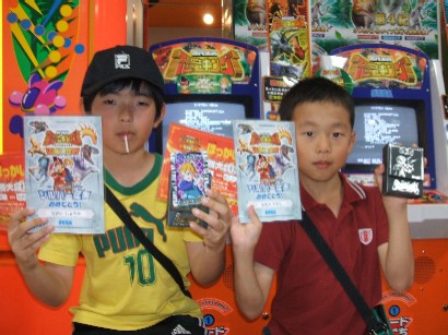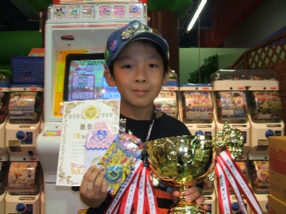 うちにとって48回目となる恐竜大会は猛者決定戦ムシスタ予選大会。息子はサウロ先発でしたが,相手カマラに一気に落とされ,続くカマラもいまいち活躍しないまま,初戦敗退となりました。この大会で見事シルバー猛者の称号を手に入れたのは,苫小牧からの遠征コンビ,ショウタ君(写真左)とタカシ君でした。優勝はショウタ君で,初レックスゲットです。決勝では一気に攻め立てました。決勝大会もムシスタ代表で頑張って欲しいと思います。さて,この日の午前中,たまごっち大会に息子と,帯広から遠征してきたセイカちゃんが参戦しました。結果は・・・息子は5度目の優勝をし,カップにまたリボンが飾られました。セイカちゃんは惜しくも3位でした。参加人数が7人だったので,じゃんけんの結果,息子が2回出ることになりました。競技は「ダンス」と「つなひき」。使うは「ひょっとこ」。「ダンス」は「だいしんゆう」と「赤提灯」。「つなひき」は一気に引くため,はじめからいてくれる「しんゆう」に「流れ星」でいきました。最初の出番,相手は「むきむきっち」でしたが,「しんゆう」に「応援+2」で「だいしんゆう」というデッキ。「ダンス」。ここは度胸満点の「ひょっとこ」が負けるわけがありません。「つなひき」。相手が「むきむきっち」に「しんゆう」をスキャンしたときは,一瞬「一気に引けないどころかパワーで負ける・・・」って考えたのですが,相手が「応援」で「だいしんゆう」にしてくれたので,助っ人が登場するまで時間がかかり,その分一気に引けて,高得点を叩き出しました。結局,この時点で息子ただ一人5000点超。2回目の出番のときは「てんさいっち2せい」を使ったりして,少々遊んでたことから相手に負けました。それでも相手はさっきの息子の最高点を超えられず,息子の1位確定です。ということで5度目のMVPとなりました。場所を移動して,2回目のたまごっち大会。参加者は16人。種目は「くりひろい」と「えんそうかい」ということでしたが,店員の間違いにより「くりひろい」×2となりました。相手は「たまこ姫」に「しんゆう」。息子はすぴーど重視ということで,「まきこ」に「だいしんゆう」そして「宝石」ということで,すぴーどを「+100」としました(まきこと宝石の相性で高くなります)。1回目,息子,落ちてくるアイテムをさくさくと取ります。結局ノーミスで評価ももらえて,3000点を超えました。2回目,よくみると相手は「しんゆう」ということで,「しんゆう」は途中で木を揺らすので,上から2個か3個同時にアイテムが落ちてきます。それだけ移動も少なくなるわけで,ポイントを稼ぎやすくなります。一方「だいしんゆう」だと,上から「だいしんゆう」自身が落ちてきて,それを取ると500点上乗せになります。息子は「だいしんゆう」をキャッチしたんですが,相手にいいアイテムが降ったのでしょう(落ちるアイテムによって点数が違うと思います)。息子がノーミスでも,素点で負けて,勝利ポイントがもらえず,2種目とることができませんでした。それでも息子は3位に入賞いたしました。1位は「はながたっち」。これもいいアイテムが落ちてきたのでしょう。セイカちゃんは4位という惜しい結果に終わりました。いまは,ムシより恐竜,恐竜よりたまごっちです(^^;)。