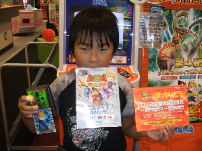 昨年の失敗から,どう変わるのか注目していましたが,やはり「ペア戦」は取りやめで,シングル戦に戻りましたね。しかも制限が「無制限」になっています。合計300という条件は,どのカードの組み合わせがいいのか,小さい子には分からないだろうという意見があったんでしょうかね。または,カードチェックを店員が行うにしても,店員自体がよく分かってないってこともあるんでしょうね。機械のカブトムシを使った場合,つよさ100ですが,それと200ムシを使ったとき,「合計320じゃないか?」というギャラリーの疑問にすぐに答えられないという店側からの苦情もあったのかも知れません。<スタッフによる対戦前のカードチェック後はカードを変更しないでいただきます。>という注意事項も,対戦相手への配慮というより,店員への配慮なのかも知れませんね。途中で変わったら,また頭がゴッチャになってしまう・・・。だから無制限にして,店員の負担を減らしたということですね。また小型ムシを使う条件だと,やはり対戦時間が長くなるので,無制限にして大会時間の短縮を図ったというのも今回条件が変わった理由でしょう。で,今回の参加賞を見てみると・・・なんと恐竜猛者と同じ参加賞じゃないですか(笑)。 ということは,いまやってる猛者って,セガ的にはムシのカーニバルと同じ扱いだったんですね・・・。ちょっとガックリです(^^;)。
