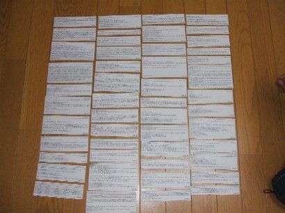 遅れましたが,当選者発表です。今回は皆さんから多くの応募をいただきました。皆さんからのコメントを並べました。たくさん書いて下さった方,短いコメントのなかに情熱をこめて下さった方,いろいろ・・・。で!このコメントのコピーをクジとして息子に引いてもらうことにしました。面積の大きい一枚が引かれやすいのか?小さい紙が息子の小さい手にフィットするのか?それでは抽選です!まず1人目の方は・・・ドラムロール・・・ジャン!ビンスさんです。おめでとうございます!1200竜については,実際にその威力を見た子と,そうでない子でやはり評価が分かれますね。無理強いはともかく,いろんな場面で実際に使ってみることをお勧めします。2人目の方です。ドラムロール・・・ジャン!ナイトキッズさんです。おめでとうございます!サウロですが,あえて勝ちに行かなくてもいいんだというのがあいこタイプの戦い方ですね。あえて負け手を控えめにするのも戦法だと思います。1回戦のカマラの戦い方を大事にしてこれからも頑張ってください。3人目の方です。ドラムロール・・・ジャン!ユウアーショックさんです。おめでとうございます!猛者の結果は如何でしたか?ショックの連続発動で好結果でしたか?よろしければご報告よろしくお願いいたします。4人目の方です。ドラムロール・・・ジャン!二児のハハさんです。おめでとうございます!うちは一人っ子ですので,息子の分は1セットで足りますが,子供が2人ですと,やはり2セット必要ですね。今回のご当選で子供さんが2人とも喜んでくれることを願ってます。5人目の方です。ドラムロール・・・ジャン!みなとさんです。おめでとうございます!恐竜の検証お疲れ様です。恐竜のファン,もっと増えて欲しいですね。恐竜キング倶楽部,実現させたいと思ってますが,一通り検証が終わってからでしょうね(^^;)。6人目の方です。ドラムロール・・・ジャン!キャノPさんです。おめでとうございます!はじめまして(笑)。恐竜に関しては不明なことが多すぎて,ちょっとやそっとじゃ検証など誰もしたがらないというのが実情でしょうね。誰かがやらねば,恐竜もすぐ下火になるかも・・・。そんな感じで今後も検証頑張ります。今週末はよろしくお願いします(^^)。さて,最後の当選者の方です。ドラムロール・・・・・・・・・・・・・・・・・・・ジャン!ARCHANさんです。おめでとうございます!太っ腹だなんて,私の体型をもじりましたか?(爆)恐竜は分からないことが多く,それゆえに人より多くのことを知ればそれだけ有利になるゲームですね。これからも細く長く情報発信を続けていこうと考えていますので,よろしくお願いいたします。ということで,7人の当選者が決まりました。よく知っている方から,今回初めましての方まで,いらっしゃいますね。コレクションに,大会使用にと,今回のアクト団カード,大切に使って下さいませ(^^)。それでですが,当選された7名の方にお願いです。13日までに私に送り先をメールにて教えてくださいませ(メールというところをクリックしていただきたいです)。13日までに連絡がない場合,他の方に権利が移る場合もありますので,よろしくお願いいたします。またメールの件名ですが,「アクト団カード当選の件で」としてください。他の件名,「ありがとうございます」ですとか,「お世話になります」ですと,頻繁に来る迷惑メールに紛れて削除してしまうかも知れません(開かないで削除ですので・・・ ^^;)。今回残念ながら落選された方には,別途返信いたしますが,これに懲りて「もうブログなんて見るもんか」とならないよう切にお願いいたします。またいつか「突然プレゼント」を企画したいと思ってますので,その際もよろしくお願いいたします。それでは皆さん,これからも恐竜頑張りましょうね(^^)。