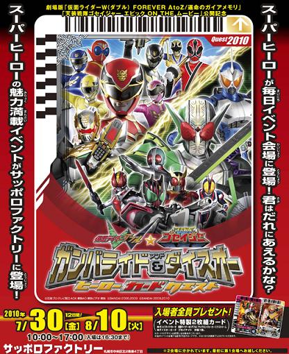 家に帰ると,確かにドラクエ夏祭りの招待状が届いていました(^^)。タイムスケジュールを見ると,10時45分から「チームバトル大会 夏祭りスペシャル」をやるみたい。でもって,どこにも年齢制限のことは書いてないから(ひとりでプレイできる人ってだけ書いてある),大人もエントリー可能かな?チームバトルの当選者は,まさか8人ってことはないと思うけど(でも時間的にそうかな・・・),もし8人なら,ちゃんと代表勇者決定戦の8つのエリアごとに「実際の住所」でエントリー者を8つに分けて,当選者を8人決めて欲しいですね。ただでさえ,全国大会がエリア的に偏っているんだから,それくらいの配慮はあって然るべきですね。王者決定戦は13時半から。あとは「冒険の書」宝くじがあるっていうし,それも楽しみ(^^)。夏祭りが17時までなのに,くじが16時50分からということで,当選番号を一気に公開ですかね(初めて行くから分かりません ^^;)。 ドラクエの話はそれくらいにして,「ガンバライド」の話! この夏,埼玉では8月7日から15日まで,「仮面ライダーワールド2010 超バイク大戦」が,さいたまスーパーアリーナで行われ,そこではこのプロモカードがもらえます。「P-121 仮面ライダーW サイクロンジョーカーエクストリーム」 いやあ,いいなあ,埼玉なんて行けないからどうしようかなあ・・・って思ってたら! なんと札幌でも,こんなイベントがあるじゃないですか!札幌ファクトリーにて,7月30日から8月10日まで,「ヒーローカードクエスト」が行われ,そこではなんとなんと!ガンバライドのプロモとダイスオーのプロモを2枚1組でもらえるようです。正月のイベントでは,池袋でガンバとダイスのプロモ,札幌でガンバのプロモのみでしたが,今回は逆に札幌が1枚プロモが多いですね(^^)。ファクトリーでもらえるガンバのプロモは,絵はないですが,「W サイクロンジョーカーエクストリーム」ってことですから,まず間違いなく「P-121」でしょう。埼玉行かないで済んだ・・・(^^;)。ちなみにダイスは「ゴセイナイト」のプロモがもらえるようですよ。埼玉より一足先に札幌で配られるプロモということで,どうですか?皆さん,夏休みに札幌に来て,プロモカードをゲットしませんか?(^^)