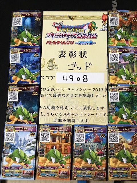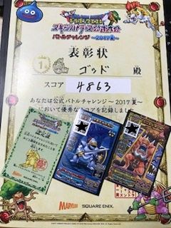 スキャンバトラーズ今日から全国で始まった公式大会!本日は旭川で行われるということで、早朝に家を出て高速で2時間ちょい、開催店舗のイオンに到着しました。開店時間の9時にエントリーして無事プロモ「シールドオーガ」をゲットしました。大会は13時開始なので、朝食をとったり、あとは最後の検証をしたり・・・ そしていざ大会開始!グレイトドラゴンたちのHPは3665でした。思ってたよりモンスターたちの体力が少し低いので、パーティを少し変更して臨みました。その結果・・・スコア4863点で息子ゴッドが1位となりました!(^^)初日に結果を出せてよかったですが、本来旭川に行ったのは、相手の体力を知るためや、装備の威力などを確かめるために行ったわけで、本番はやはり地元札幌で明日行われる大会だと思ってます。今日の結果を踏まえると、微調整したらもしかしたら5000点を超えることが出来るかも?どうなりますやら。