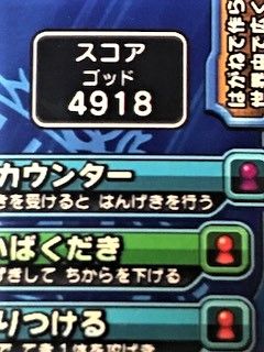 スキャンバトラーズこんなところからハイスコアを伸ばしていくことになります。検証がてらやってみて、4473点ですが、これはまだまだ伸びしろはあります。ありますが・・・非常に面倒というか・・・シドーの繰り出す技がランダムっぽい?1ラウンド目に全体攻撃を仕掛けたと思ったら、次のプレイの1ラウンド目は単体攻撃×2だったり。こちらのチームレベルによって技が変わるのかと思いきや、そうでもないみたいで。ガードも全体攻撃を受けるときは運がよければ出ますが、単体攻撃×2で2回とも主人公に攻撃が来なかったら目も当てられない・・・ 理論的なマックスは・・・与えたダメージスコア 5999まで削り、SPが会心で5400いけば1139点テンションチャージスコア 600点ガード・攻撃タイミング押しスコア 4.3秒くらいで4個ボタンのガードを4回成功で172×4=688 モンスターが全部で6回グレート、主人公のカウンター攻撃4回グレート SPのグレートで11回×45=495 688+495=1183点とどめスコア SP3のスペシャルで1000点操作時間ボーナス 450点連携・合体スコア 3体連携で300点2ターン以内討伐ボーナス 750点これらを全部足して5422点がマックスな感じです。ですが、会心がどこまで行くか分かりませんし、ガードや攻撃も何回できるか不安定なので、ここまでの数字はちょっとやそっとの金額を使っただけじゃ出ないでしょうね(^^;)。せいぜい5700まで削って会心4800、ガードは1回で主人公の攻撃は2回という4727点をまずは目標点数とします!