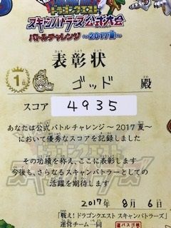 スキャンバトラーズ!今日は昨日に続き、地元札幌で行われたバトルチャレンジの模様を。昨日は旭川の大会でしたが、優勝はしたものの、相手モンスターチームの体力を残し過ぎたので、主人公の火力を少し上げて臨みました。その結果・・・スコアを上乗せした息子ゴッドが、4935点で連日の優勝となりました(^^)。ところで今日の大会の参加者は、全部で11人となってまして、ちなみに・・・2位は私です(昨日の大会も私2位でした ^^;)。そして今日の3位はTKママさんということで、おめでとうございます!再来週のタッグ戦は、我が家はTKママさん家と子は子、親は親って感じで組んで出る約束を交わしました。再来週、よろしくお願いいたします!(^^) ところで、ロトの盾によるガードですが、大会モードだと3回が上限なんですかね。それとも運が良ければ主人公が攻撃されるたび毎回出たりするんでしょうか?息子の場合、昨日は1ターン目にガードが3回で終わり、今日は1ターン目1回、2ターン目2回ということで、今日はもうひとつ出ていれば5000点を超えたであろうということでどうなっているのかと。いずれにしても大会は・・・SP玉持ちのモンスを最低でも1体使って3体連携で組んで、何でもスキャンを駆使してさっさとテンションチャージとワザ選択をして、より多い回数グレートを出しながら攻撃してより多く4ボタンガードをし、テンションを4体とも一度はマックスにして、2ターン目が終わる前に3玉SPを撃つべし!