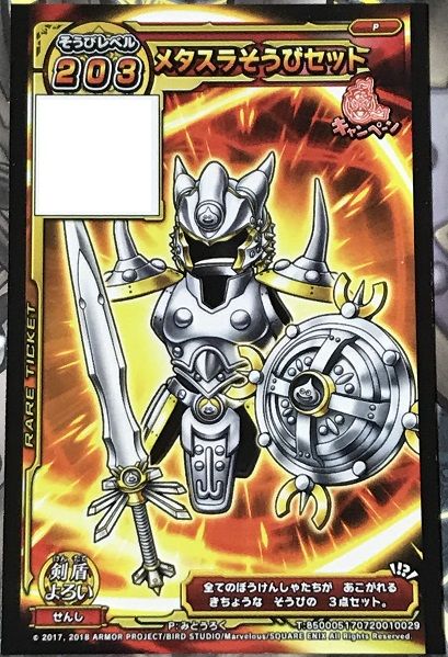 スキャンバトラーズ明後日から超6弾ということで、今日明日はプレイをもう控えちゃってる人も多いのかな?私も本日4回ほど真レオにチャレンジして2勝2敗で超5弾を終えました。明日の夜はお祭りに行って来ようかなとか思ってるので(出店でお好み焼きとか食べたいな ^^)。 結局超5弾では、ゾルデは15枚になりました。まあお腹いっぱいですね(笑)。 さて、明後日から始まる超6弾ですが、装備の目玉はやはりメタキンの剣、よろい、盾でしょうか。それらはギガレアですので、集めるのも結構苦労すると思いますが・・・へへへ、これさえあれば大丈夫ですよね!このチケット1枚で目玉装備が揃っちゃうんですよね?え?超6弾のギガレアはメタキン装備で、このチケはメタスラ装備だから違うの~?使えないじゃな~い(笑)。 さ、初日コンプするぞー!(^^)