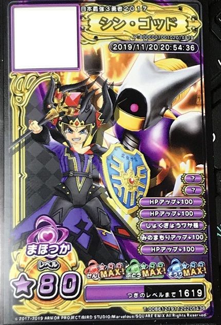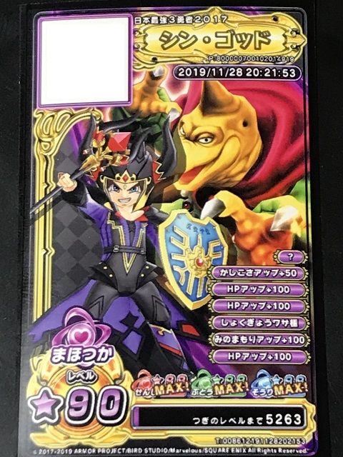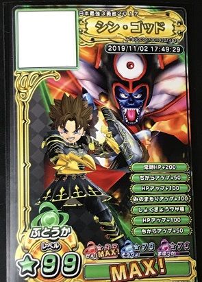 スキャンバトラーズいやあ、今日コンビニですんごく気持ち悪い商品を見ました。スナック菓子の袋がね・・・ さて、あるのかないのか分からない日本最強に向けて私シン・ゴッドのレベル上げを毎日やってますが・・・本日、ようやく僧侶がレベル★90に到達しました。新3弾前にマックスにするのはあと3日しかないので、1日2レベルくらい上げて(夜だけプレイなのでそれも苦しいけど)、あとは新3弾の連コで仕上げるかな。僧侶でHP40000のゾーマを倒すのは息子でも大変だったくらいだから私が出来るかどうか・・・なんなら息子にやってもらえばいいか(^^;)。魔法使いはまだ★70なので、2019冬大会後の経験値キャンペーンを利用しながら上げて行き、日本最強では4職業オールマックスで挑んで・・・撃沈したいと思います(笑)。 さあ明日です。明日日本最強の開催告知があるはずです。ジャンフェスのメーカーブース情報(スクエニ)も更新されるはずですが・・・何もなければジャンフェスでは日本最強はやらないってことでしょう。