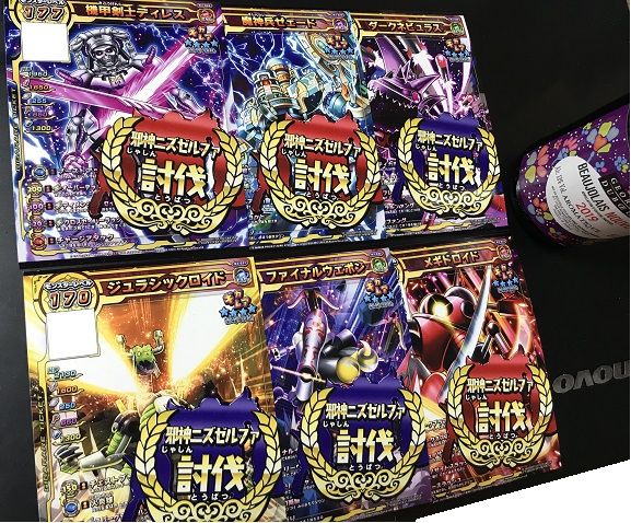 スキャンバトラーズレベル上げをしながら赤スタンプ集め。そして時々青スタンプ・・・ファイナルウェポンにも青スタンプが付いて、これでギガレアモンスターは赤もしくは青スタンプが付きました。で、今日はボジョレー・ヌーヴォーの解禁日なので、一緒に写真に収めました。おいしいワインを飲みながら眺めるギガレアモンスターチケット・・・至福の時(^^)。 ところで日本最強の詳細が明らかになり、そのなかで「おかわり権」のことも触れられていましたが・・・これって顔写真の確認はしなくてもOKみたいですね。保険証って書いてるけど、保険証に顔写真なんて付いてないでしょ?エリア優勝時に皆「本名」で写真掲載等の承諾書にサインしたと思うけど、その本名を運営が持っていて、それと保険証や免許証に書いてある名前と照合する感じですね。でもこれじゃあエントリーチケや賞状とともに保険証を誰かに預けたら、その人は日本最強でおかわり権を行使出来ちゃいますね。大人は免許証等できっちり『本名』とともに『顔』の確認をしますよ、小学生以下に限り保険証でもOKですよ。そのあたりの本人確認はファストチケットの本人確認に準拠しますよ。そういうふうにちゃんと謳ったほうがいいんじゃないか? ていうか、その場でもう1回プレイとかじゃなく、14時15分から「おかわり権を持つ方に一斉に1回プレイしてもらいます」ってしたほうが現場も楽だったんじゃないかね。で、おかわり権カードだけど、失くしたとか言って使わなければ持って帰れる?カードがどんなものか実際に見てみないと分からないけど、美しいカードなら欲しくなりますよね。終盤までにそれなりのスコアが出ていれば、おかわり権は行使しない可能性も・・・でもまあ、きっと画用紙に手で「○○エリア おかわり権」って書いててパウチしただけのダサいものだったりして(^^;)。