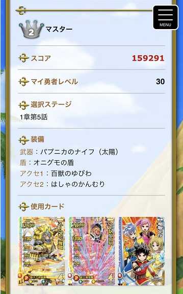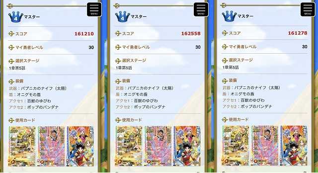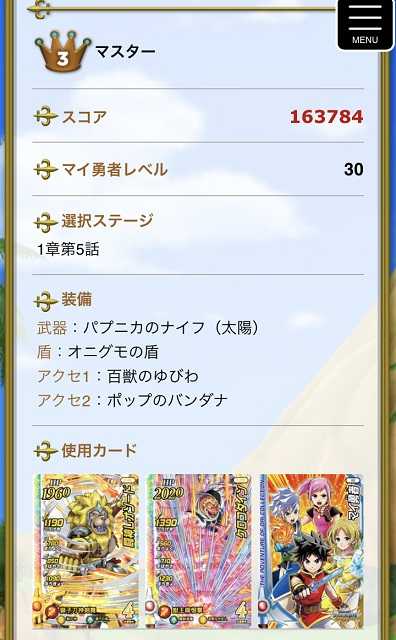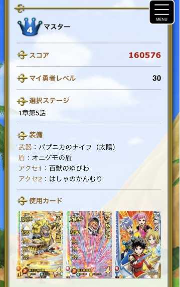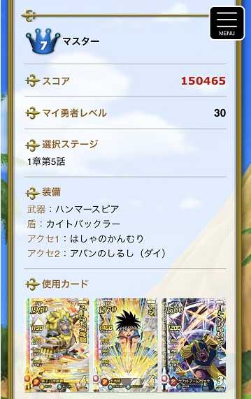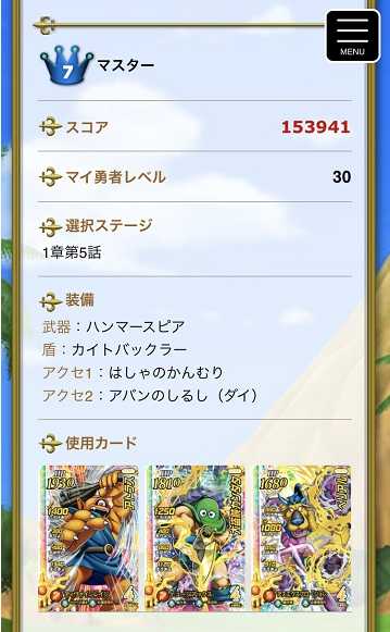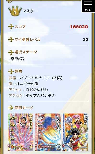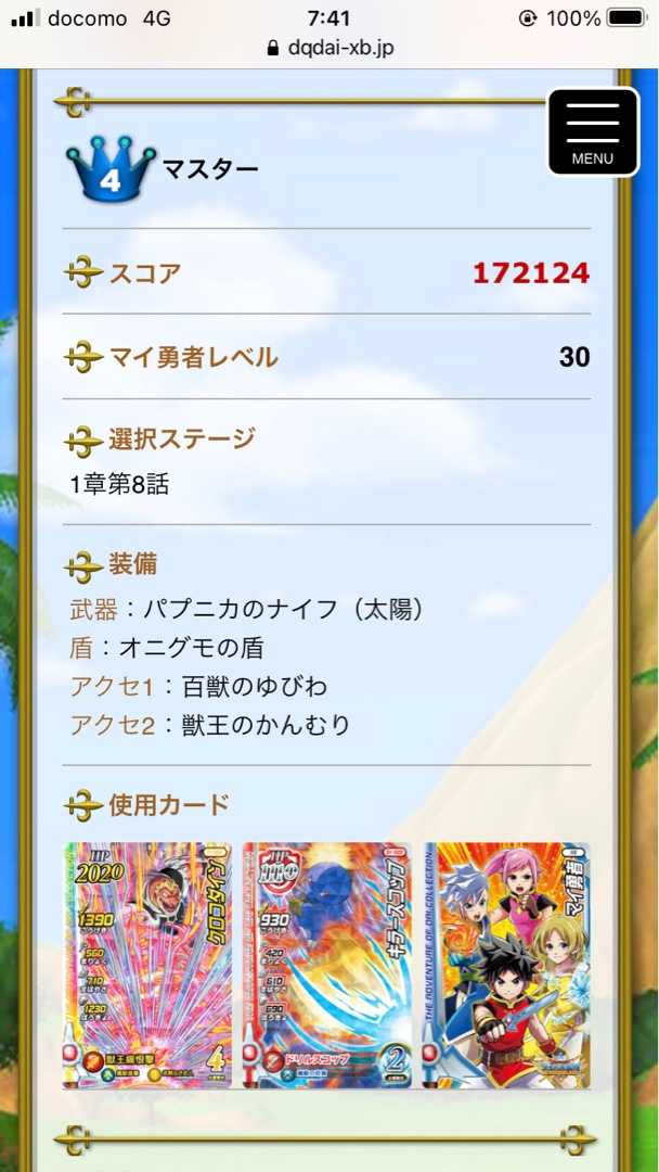 クロスブレイド スコアタ・・・今朝の発表で「4位」となりました。 ですが! 1章8話(クロコ)をプレイした人のなかでは、めでたく初日トップになりました!(^^) 皆さん、スコアタのためにわざわざ1章5話を? であれば、どこか忘れましたが、またキメラがいたステージがあったので、そこでやるのもアリかな? しかし、今回のこのスコアですが、最後のクロコの必殺技でまたまたグレートというオチ(^^;)。 普段ミスしないんだけどなあ(緊張してる? 笑) 8話も基本的に5話と同じ攻め方ですね(キラパンの扱いは要注意ですが)。 竜王ですが・・・「ふつう」から「ギガつよ」まで攻めましたが、もらった報酬でマイ勇者の装備に入ったのは初回報酬の2個くらいかな。 前日MAXにしたというのに、メガネのオンパレードには参りました(笑)。 そして、ようやく手袋とバンダナもMAXになりました。 バンダナ・・・もうきっと使わないでしょうね(^^;)。 このあとはやはり「獣王のかんむり」を仕上げたいけど、なかなか出なさそうで真空の斧より苦労するかもですね。