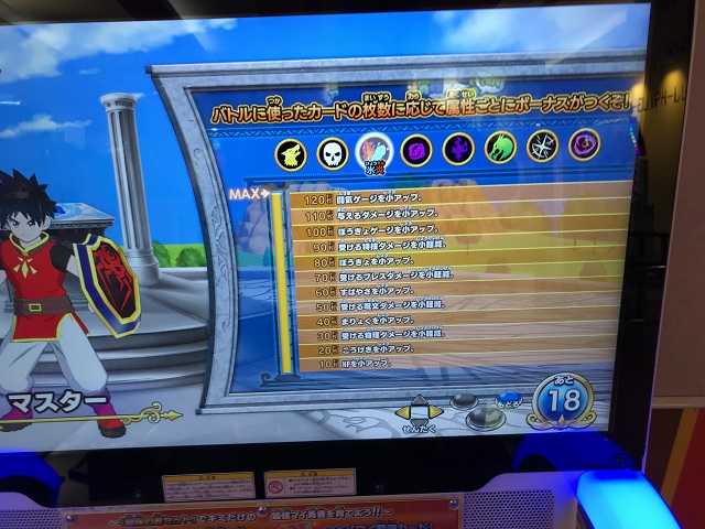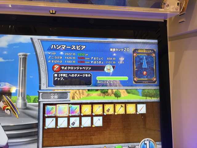 クロスブレイド 稼働初日に買った冒険の書も、めでたく残り1回となり、「残り0回」にしてから引き継ぐのは何かあってエラー起こしたら大変なので早速引き継ぎ。 全国の仲間から送ってもらった「おためし冒険の書(30回)」があるので、『中継ぎ』として使おうと筐体にセットしたら・・・ おためし版には引き継げないよ!的なメッセージが。 ええっ!製品版(400回)の冒険の書から、おためし版には引き継げないの? 聞いてないよ~(驚)。 過去、ICカードを使ったゲームもやって来たけど、イベントとかで配布されたICカードだって普通に使えたのに・・・ おためし版→製品版の引き継ぎは出来て、製品版→おためし版は出来ないってことなら、おためし版→おためし版の引き継ぎも出来ないんじゃないかな。 とりあえずお店にあった冒険の書セットを2セット買いました(家にまだ2セットあるけど)。 でもって製品版に引き継ぎして、プレイ再開です(^^)。 カイトバックラー(盾)がMAXになりました。 これで虹色盾は3つともランク20でMAXになりました(他の盾もほぼほぼMAXです)。 さて、今日からクロコダインと戦えて、「真空の斧」をもらった訳ですが、もうひとつ、アクセサリーで「百獣のゆびわ」というのも出て来ましたね。 「真空の斧」は『攻撃に稲妻属性を追加。敵「ヒュンケル」へのダメージを中アップ』というもの。 「百獣のゆびわ」は『マイ勇者の属性が【百獣】になる。(常時)』ということで、マイ勇者も今後アクセで属性をいじれそうですね。 「真空の斧」は連コでは出て来ないみたいで、クロコステージをやらなければダメみたいですが、装備ランク10まではランクアップに必要な数は1なのでランク10までは楽に上がります(10を越えると必要数が2になってました)。 でもって、やっと出た! シクレハドラーをようやく自引きして2枚になりました(左はオクで買ったハドラーです)。 クロブレの神様は我を見捨てなかった!(^^) そしてランキング。 今日は39位だったようで。 明日はもう少し上に行けるかな? まあ動かし方は分かってるんで「妖魔」でおためし。 コンティニューなしでそれなりのスコアが出せました。