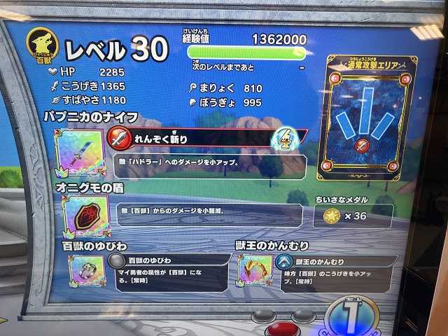 クロスブレイド昨日のプレイによる今朝のランキングは「6位」でしたね。ちょっとやり過ぎた?今日出したスコアはどうだろう・・・明日こそ「9位」になれるかな?(^^)で、今朝のランキングで、久々にスタートダッシュチャレンジステージをプレイした人がいましたね。まあ、1位になりたかったらやっちゃうかな(笑)。でも、この「勝手にプレイスコアを筐体から吸い上げるスタイル」だと、試しにスタートダッシュチャレンジステージでプレイしたとき、「このスコアはランキングに載せなくていいや」って出来ないですもんね。スキャバトだったら、いいスコア出しても、1回チケットを印刷して、それを登録するかどうするか、自分で選択出来たりもしたんだけど、問答無用でスコアを公開ってのも強引ですね。 ところで、「真空の斧」がMAXになった後、「百獣のゆびわ」をMAXにしようと、クロコのギガつよと必死に戦ってますが、いらんのに「真空の斧」や「まほうの盾」とか出て来るの止めてくれ~そしてクロコのお供のシャドウパンサーを倒したときに経験値に変わるの本当に止めてくれ!経験値になるくらいなら銀色装備に変わるか、ほどよく虹色装備に変わってくれよ~もう経験値はいらないんだよ!だっていまこんなだし・・・レベルはカンストしてるけど、貯まった経験値は現在82万オーバー。これ、2弾になってまた最初連コしたら、あっという間に2弾もカンストしちゃうんじゃ?(笑)しかし、HPはどのモンスターより高くて、攻撃系の装備着けてることでこうげき値、すばやさ値ともトップクラスですね。ところで「ちいさなメダル」って何に使うの?(^^;)