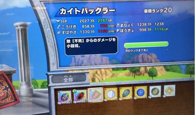 クロスブレイドさてさて、ランキングですが、昨日マネマネ登場でヘルクラ入りデッキをモシャスしたわけですが・・・ラッキー7!7位になり、ようやくトップページ(ベスト10)に載せることが出来ました(^^)。やはり15万点はひとつのボーダーですかね。でもって、今日も、まるでブブカの高跳び記録のようにスコアを少しだけ伸ばしたわけですが・・・ちょっと心配な点があり、ランキングに載るのかどうか・・・ところで、クロブレは、スキャバトランカー勢も多くプレイしているようですが、ハイスコアの取り方を知っているのに知らんぷり?な~ぜ~ な~ぜ~なの~♪(笑) そして今日は、1弾で出ている【盾】装備ですが、装備ランクをすべてMAXにすることが出来ました!画像をアップしますが、マイ勇者がカイトバックラーを付けているという条件下でステータスの上下を見てくださいね。ステータスの変化値については、なんか他の装備によって微妙に変わる?みたいな気がするので、皆さんがご自分で実際に付け替えたときの数値を見て選んでくださいね。でもまあ、虹色装備以外の装備は選ばないと思いますが(^^;)。