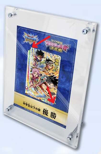 クロスブレイド週末から始まるエリア大会だけど・・・スコアアタック予選で複数回プレイ出来たとして有効となるのは最後に出したスコア???一番高かったスコアじゃなくて、最後のスコアが低くてもそのスコアが有効ってね、1人が何回プレイ出来るかなんて、時の運だと思うけど、そもそも「スコアタ自体が運頼み」なのに『最後のスコアが有効』は無いわ。また、まあそんなことは現実には無いと思うけど、2人対戦本戦でライフで決着が付かず、与えたダメージでも決着が付かない時は使用カードのHP合計値が低い方が勝ち?それってマイ勇者を使ってて、装備&パーティが同じなら「勇者レベルが低い方が勝ち」ってことですよね。勇者レベルが低いってことはこうげき値などのステも低くなるからそれでダメが同じってことは無いんだけど、万一そんなことがあったとして『勇者レベルが低い方が勝ち』って、これはもうレベルが高くないプレイヤーに多く参加してもらうためのリップサービスだとしても、最強を謳う大会ではあり得ないことですね。まあ、こんなこと言ってるからマイ勇者が60のまま3弾に渡って上がらなくなったし、70のまま真1弾から真3弾までマイ勇者のレベルが上がらないという「ぬるま湯」状態を作ることになっちゃったんだね・・・頑張ってマイ勇者レベルを上げ、次のレベル上限撤廃に向け余剰経験値を増やしたプレイヤーに対する冒涜でしかないんだわ。 そんでもって上位がもらえるという楯だけど・・・矢印付けましたけど、マイ勇者カードの角が台紙の切り込みのなかに差し込まれているんですね。これって市販の冒険の書セットでもそうなんだけど、マイ勇者カードに切り込みの「跡」が付くんだよね・・・美品コレクターにしてみれば悲鳴あげちゃうレベルですよ。カードゲームの運営にあるまじき扱いですね。
