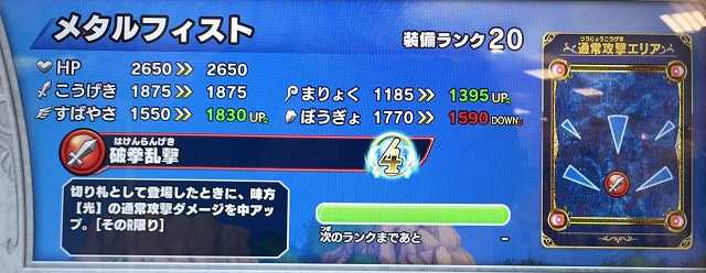 クロスブレイド北海道の店舗大会がマンボウの影響によりスコアタ大会がひとつだけという状況に・・・仕方ないことですが・・・いまのコロナ状況で、関東、関西が大会を開催してるというのに北国で大会を開催しないというのはなんかモヤモヤしちゃいますね。で、今日は九州でエリア大会が?中学生以下の部の決勝トーナメントにシード発生???スコアタ予選に何人来たの???イオンファンタジー運営がどう思ったかは知らないけど、だからさあ中学生以下の部じゃなくて「中学生以下&50歳以上の部」にすればいいのにって何回言えば・・・ さて、今日から始まった新トナメ「豪速拳杯」ですが・・・メタルフィスト、グレイトアックス、魔法の闘衣のかんむり、マァムの肩当てが装備ランクMAXになりました!使える?使えない?どっち?