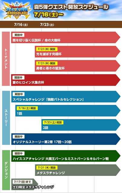 クロスブレイド明日、強敵バトルセレクションの後半4ステージが開放される訳ですが、その後にスケジュールが更新されると思ってたら、いきなり更新されてて・・・なんか最近、告知がイイカゲンになってないか?運営は。新トーナメント「光を滅ぼす究極杯」にはついに「光魔の杖」が出るか?あとは「勇者と導きの盟友杯」だけど、サバイバルトーナメントで2つとも片付けることが出来るかな。まあメタキンピックアップもあるからどちらかのトナメは週末に回すかも。ところでCPパックの告知は・・・ メタスラチャレンジは「土日限定」の枠で始まると思ってたらハイスコアチャレンジ枠で始まるの?てことはハイスコアチャレンジ2は無いのかな?真4弾はいまのハイスコアチャレンジで最後までやるつもりなんだろうか・・・。そしてそのメタスラチャレンジだけど、日程が8月31日まで???真6弾が8月25日に始まると思うんだけど、他のイベントのようにメタスラチャレンジも8月24日までじゃないのかなあ。8月31日までとしているのが間違いなのか、それともまさか真5弾CPパックが8月25日からで真6弾は9月下旬スタートなのか・・・早く告知してくれよ!