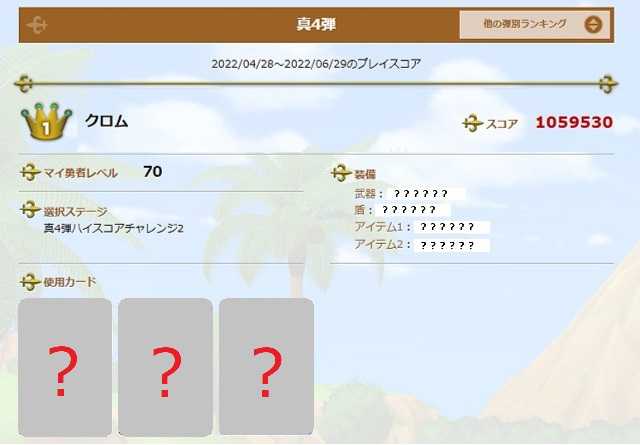 クロスブレイドハイスコアチャレンジ・・・またの名を「必殺チャレンジ」今日から始まったステージのスーパークリア条件が・・・ これじゃあね・・・「どうのつるぎ」の出番か?「てつのつるぎ」のほうがいいのか?キラパンが来るか?それともばくだん岩がアップし始めたか? ところでランキングの修正はどうしたのかな。未反映のデータは揃ったんだから早く修正したランキングを公開してくださいよ。あと、メタキンのやりはどうなった?連コ30枚につきメタキンのやり2個出たことにするでいいじゃん。通常連コ30枚で虹箱が最低でも6箱出るんだけど、まあここは不具合解消ということでメタキンの剣2個、メタキンの盾2個、そしてメタキンのやり2個という計算でいいよ。いろんなパターンを加味したら面倒になるし。なので私は900枚の連コだからメタキンのやりが900÷30×2個=60個ということで35個をオーバーしてるから装備ランク20でMAXになっているやりを返してください。これで例えば2パック分200枚の連コなら、200÷30×2個=13~14個返す感じかな。いずれにしても早くしてもらいたいね・・・あ!もしかしてだけど、運営は明日の私の誕生日にサプライズでやりを返すつもりなんじゃないの~♪(^^)