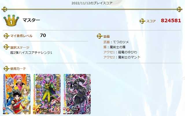 クロスブレイドWEBデイリースコアタ初日の結果が出ましたが、不具合バーン無しで30位の方までが認定証対象ということでしたが・・・不具合バーン無しの30位は「全体で言えば64位」でスコアは「764,580点」でした。このスコアより高い方は初日の認定証対象となりますので、明日告知されると思いますが、認定証をもらうための手続きは忘れずに行ってくださいね。ちなみに私は「全体の20位」ということで認定証対象となりました。不具合バーンが載ってる記念の認定証がもらえます(^^)。 今日のプレイですが・・・ネルゲルでこんなスコアも出て、これでも認定証対象になると思いましたが・・・ノーマルバーン使って、こんなスコアも出たので、こっちのスコアが明日ランキングに反映されれば!ところでランキング見てて、やけにパラレルバーンの使用率が高いって思いませんかね。そんなにみんなが持ってるようなカード?親子、友人同士なら1枚のパラレルバーンを使い回ししてるってのもあるんでしょうけど(禁止じゃないですし)、もしかして冒険の書のQRコードのコピー送ったりして遠隔地での代理プレイとかあったりする? 明日発売のVジャンプが本屋に置いてあったので買ってきました。24日から切り替わるコレクション2のGRやクリスマスSRのスキルとか載ってましたが、だから先週カードが公開されなかったんですね。あと、Vジャンプの来月号でおためし冒険の書が付録になるようです。竜魔人ダイの絵になってるのと、記録回数が60回になってますね。使わないけど、このために買うことになるでしょう。10種付いてる宝箱ゲットコードは・・・期待出来ないね。また、1月4日発売の最強ジャンプ2月号にはなんと「マイ勇者カード」(画像は本誌にあります)が付きます。つい先日、夏祭りで冒険の書やマイ勇者カードを無料配布したばかりだというのに、なんでまた・・・使えるSPカードのほうが良かったのにね。それからおためし冒険の書を何枚も持っていても、おためしからおためしへのデータ引き継ぎは出来ないので気を付けてください。おためしは市販の冒険の書にしか引き継ぎ出来ませんし、逆に市販の冒険の書からおためしにも引き継げないです。12月2日発売のコミックス4巻にもSPカードが付きますよ(12月2日は金曜日だから北海道は2日遅れの土日遅れがあって12月7日くらいに発売かな)。