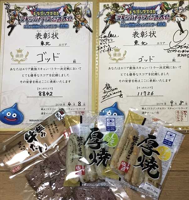 クロスブレイド今日は東北エリアで秋祭りが行われたんですね。こちら札幌のイオンでは宮城東北フェアをやっていたんですが、懐かしさについ牛タンと笹かまに手が伸びました。なぜ懐かしいのかと言えば!仙台で行われたエリア最強スキャンバトラー決定戦「東北エリア」で息子ゴッドが2連覇を果たしたことが忘れられなくて(^^;)。定年退職したら日本全国の思い出の地を再び訪ねようと思っているので仙台も必ず! さて、スコチャレですが、朝に数回プレイしたなかでようやくやりたいことが出来ました。パーフェクトガードが安定しないのは相変わらずですが、最近はスマッシュがグッドになったり、連携必殺のインパクトがグレートになったりするからもー大変です(目の衰え? ^^;)。でもまあこれで「ツメ」はひとまず成功ってことで、次は「杖」でハイスコアを出してみたいと思います。