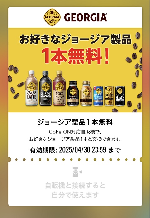 本日2月24日から3月23日までの間、朝5時~11時にジョージアペット製品を買うと抽選で10万人にドリンクチケットが当たる・・・当たりました!1人4枚まで当たるってことですからそれなりに当たるんでしょう。まあ、来週日曜まで毎日ペット製品を買わなくちゃいけないんで、あと1枚くらい当たれば御の字ですね。 明日はミャクミャクスタンプをもらい、明後日は2週間チャレンジ・・・そして土曜から新しいビンゴカードが届くから毎日ジョージアを買うモチベは維持できるでしょう(^^)。