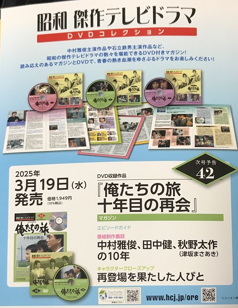 延々と買っている「昭和傑作テレビドラマDVDコレクション」ですが・・・最新41号は「青春ド真中!」の最終回でした。こういう類によくある話ですけど、もう41号にもなると書店で買う人も激減するからか、見つけるのに一苦労です。今号もイオンを3店舗巡ってようやく見つけました。で、次号ですけど・・・俺たちの旅「10年目の再会」が収録されているようです。DVDセットにも付いてましたし、私は持ってますけど、まだ持っていない方はこの機会にどうでしょう。で、私は折に触れて言ってますけど・・・「10年目」「20年目」「30年目」と進むほど「俺たちの旅」がおかしくなっていったと思います。カースケのキャラが「俺たちの旅」放映終了後の中村雅俊氏の売れ方?に伴い、『いい人』にどんどん傾いて行ったと・・・今年は『50年目』です。一旦「いい人」になったカースケキャラを壊すなどして「俺たちの旅」を立て直して、そしてフィナーレを描いて欲しいと思います。 そして今日は王将戦第5局1日目が行われました。藤井王将が若干リードして1日目が終わりました・・・このまま防衛してもらいたいです。