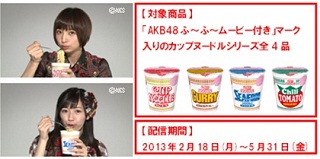 「カップヌードル AKB48メッセージムービー付き」シリーズは、AKB48全メンバー83名 (研究生含む) の「ふ~ふ~ムービー」が見られる数量限定商品です。フタ裏に記載された専用サイトにアクセスし、シリアルナンバーを入力すると、AKB48のメンバーがカップヌードルが出来上がるまでの間に熱々の自己PRをして、最後に出来上がった熱々のカップヌードルを「ふ~ふ~」するムービーをご覧いただけます。