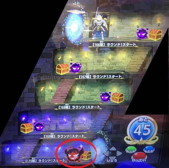 この画面のとき、赤丸つけたところにたまに虹箱来て、「お、そこでゴールドマン?」って思っても騙されるんだが、この階層画面で、ゴールドマンが出て来るなら5個の箱のどれかが虹箱になってて予告してくれるってしてもらいたい。