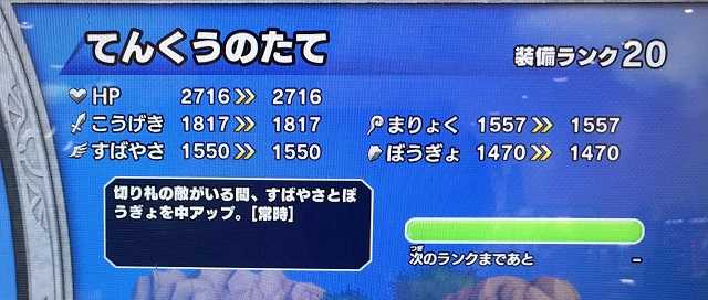 ひとつ前の記事の装備はつるぎもたてもランク2でしたが、ランク20でステもだいぶ上がりましたね。