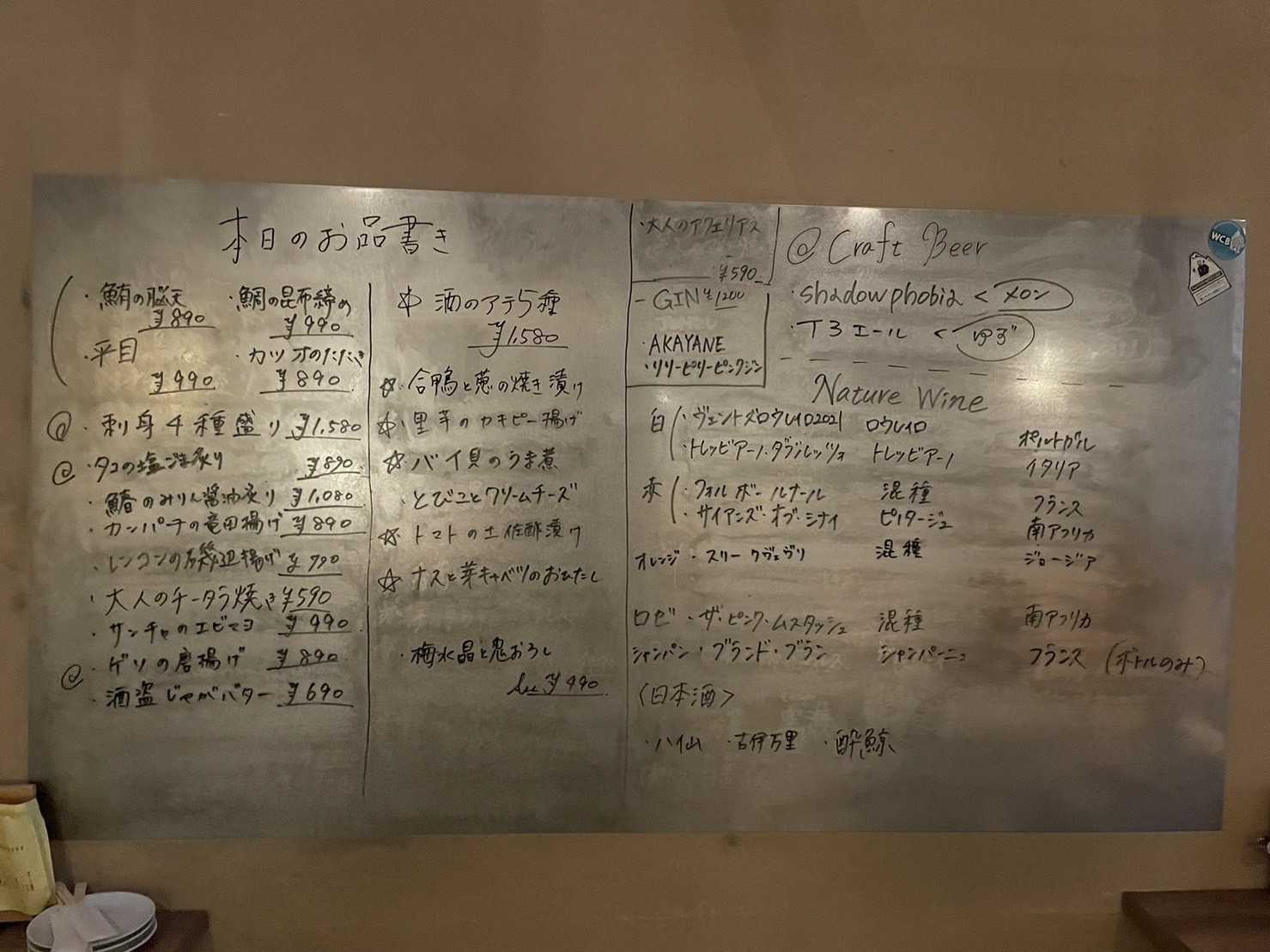日替わりメニュー。 店員さんが見やすいように自分のスマホにAirDropで送ってくれます。 ◎が付いているものがオススメメニューとのこと。 遊び心のあるものが沢山あって食材の組み合わせが面白くて見た目もオシャレです。