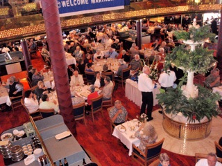 今日はこのクルーズ始めての海上日、波も穏やかでクルーズ船も流れる様に進みます。まったく揺れる事無く船の中に居るとは感じません。これ迄何度もクルーズを経験して来ましたが、こんなにスムーズなのは始めてです。 今日のランチは以前このクルーズ・ラインを利用した方々を招待した、キャプテン主催のイベントがありました。でも丁度ランチに出かけようとした時、マイクのコンピューターにログインしていたネットが、ログアウト出来ません。ログアウト出来ないとずっとそのままチャージされる事になります。何度やってもダメで、時間も過ぎてきたので、キャプテン・ランチへ行くのは辞めにしました。 そうこうしてやっとマイクのPCもログアウト出来ました。クルーズではこんなネットの、アクシデントはしょっ中あり困ります。 毎日食べ物のイベントがありますが、今日はプールサイドでモンゴリアン・バーベキューです。お肉やシーフード、お野菜が並んでいますが、自分で好きな物をチョイス、目の前でクックしてくれるバーベキューは、とても美味しかったです。時にはこんな豪快なアジアン料理も恋しくなります。 今夜は2度目のファーマル・ナイト、ブルーのドレスを着ました。マイクはタキシードは着ないと言ってスーツにしました。 デイブとマリアンとも同じテーブル、同じ船内に居て2日間お会いしませんでした。 オーダーしたサーフ・ターフはロブスターとビーフでした。 ショーの後、ピアノ・マンが演奏するバーへ行き皆で歌を歌いました。 ご覧の様な方々の年代の歌が多くを占めていました。 何故か私も殆どのメロデイーを知っていました。年代が分かります。水知らずの人達との合唱はとても楽しい一時でした。明日はこのクルーズ船、フランスの面影を残すケベックへ向かいます。お楽しみにね。