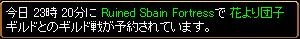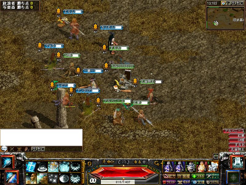 相手 花より団子時間23時20分場所 スバイン放浪側集まり薩摩藩から期間限定移籍してきた3人が抜けてエロムが戻ってきました。WIZ3 剣士1 BIS2アチャ4 ネクロ1やく2PTぐらいですね。先制は放浪 戻ってきたエロムがとりました。さすがエース^-^アチャPTのWIZがやられるが即引いて復活させる。WIZやられるがエースが取り返す(・∀・)イイ!!相手のエースにやられ紅死亡(・∀・)ニヤニヤその後おでが重いせいか固まってしまって、回線引っこ抜いて一度落ちてまた戻ってくると死んでましたw他にも何人か死んでますねw何とか復活して立て直す。エースとなぜか今日は調子よかったアルさん活躍してました^-^;;相手範囲PTとその他PTの2PTだたかな?相手のエースを抑えつつやわいひとを次々倒す。結果 放浪の勝ち花より団子様 対戦ありがとうございました。