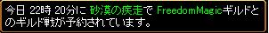 相手 FreedomMagic時間 22時20分場所 砂漠の疾走放浪側集まり WIZ1 ネクロ1 剣士2 BIS3 アチャ3 PT構成 1PT+BISとネクロの2人で組みました。先制するもすぐにやられ逆転されました><相手は2PTで剣士が主力 秘密卒の人がゴロゴロいますねぇ・・・タゲが集中して1度目の死亡><自分がやられ味方も次々とやられていく><そして2度目の死><すぐ起きて逃げようとしたけど見つかりやられる><巻物のタイミングを間違えたぜ(ノД`)何とか復活してにげるも4度目の死亡orz すぐ起きてなんとか復活するもすぐ追いかけられて見方をコルするも復活させることができませんでした><巻物で復活を試み仲間><だけど相手の火力に瞬殺(ノД`)結果 放浪の負け WIZ1って事もあるけどWIZ増えたところでかわらないと思った>< FreedomMagic様対戦ありがとうございました。