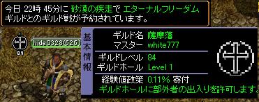 え~放浪は5日の日曜からリンクにもあるwhite777が率いる、薩摩藩に期間限定合併いたしました。まだ移籍してない人もまだ大丈夫なんでアルさんかおでに言ってください。そして 移籍そうそう相手がエタフリとゆうねwいや~~多いですねwwwwこんな多いGvは久しぶりだwww惜しくも負けてしまいました><詳しいGv内容はwhit777さんのブログに行って見てきてくだs(ryエターナルフリーダム様対戦ありがとうございました。