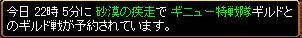 相手 写楽斎時間 23時30分場所 スバイン放浪側集まりWIZ3 剣士1 ネクロ1アチャ4 武道1 BIS2先制は放浪側1度相手がWIZ1のみになったので一旦引いて立て直させる。失点は武道が1回やられました。ナンさんが毛玉で倒すw結果放浪の勝ち相手は1PTで1人WIZが固いと思いました。写楽斎様対戦ありがとうございました。