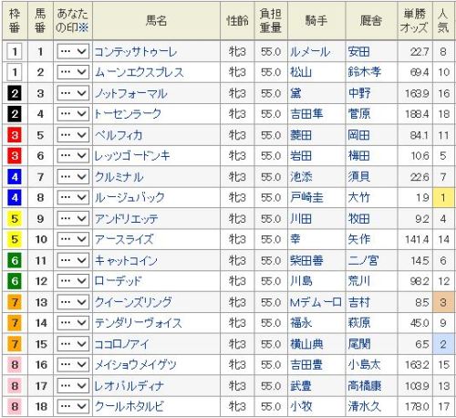 頭抜けているはずだが・・・◎ 8 ルージュバック 臨戦過程に疑問が〇 15 ココロノアイ 安定力に期待▲ 9 アンドリエッテ 末脚炸裂△ 6 レッツゴ-ドンキ 前目抜け出す△ 2 ムーンエクスプレス これが穴買い目: