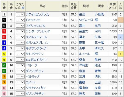 人気どころで良さそうだが・・・◎ 7 キタサンブラック 中山で「まつり」が聴けるか〇 8 サトノクラウン ここ勝てばダービーも▲ 2 ドゥラメンテ 切れ味鋭い△ 5 リアルスティール 馬場不向きか△ 15 ダノンプラチナ 外枠が買い目: