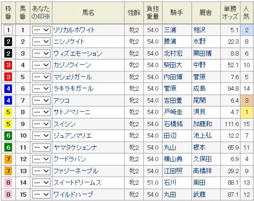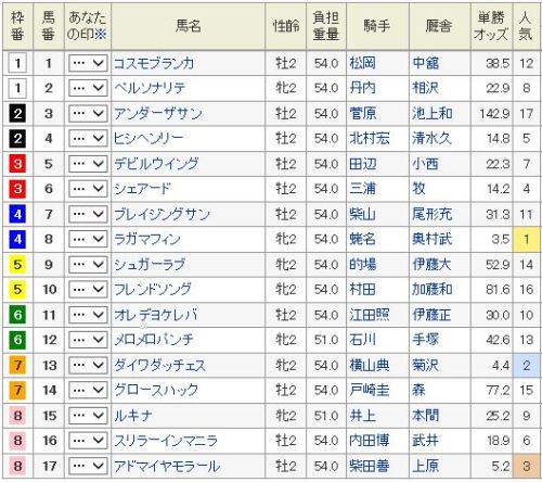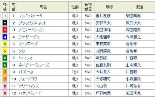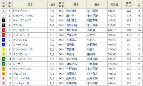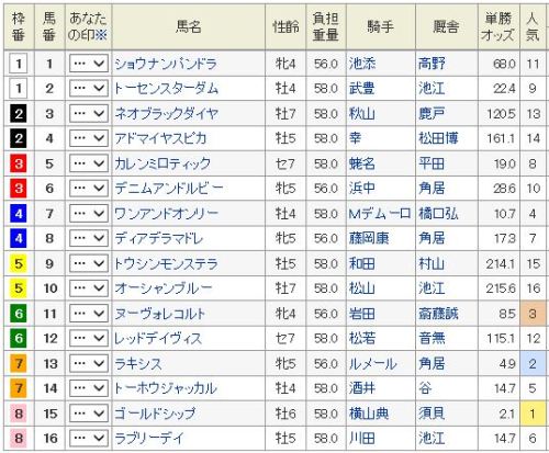 意外と混戦か◎ 15 ゴールドシップ 実績通りに〇 13 ラキシス 充実一途▲ 5 カレンミロティック 前目粘る△ 6 デニムアンドルビー 前がやり合うなら△ 3 ネオブラックダイヤ 穴はこれ買い目: