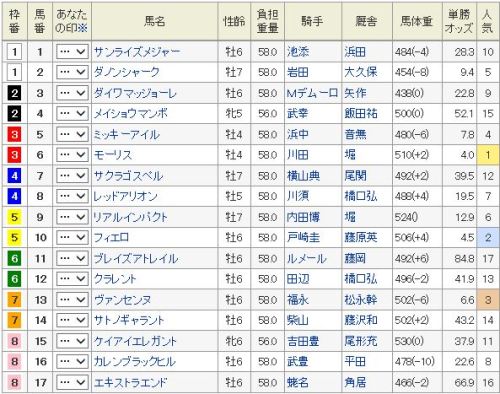 2頭が引き離す◎ 5 ミッキーアイル 前目粘る〇 6 モーリス 充実一途▲ 10 フィエロ 名手戸崎△ 2 ダノンシャーク 2週連続内枠利して△ 1 サンライズメジャー 成績安定買い目: