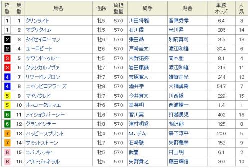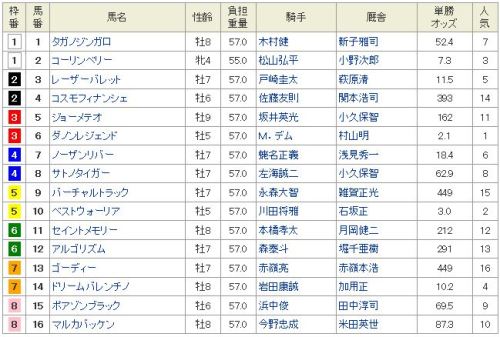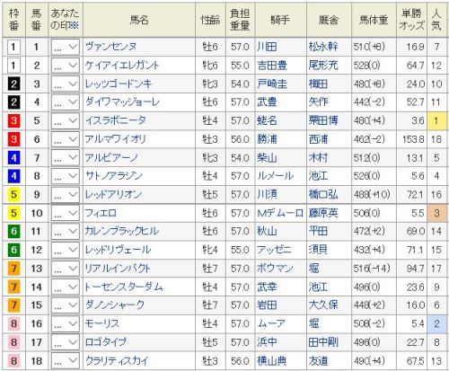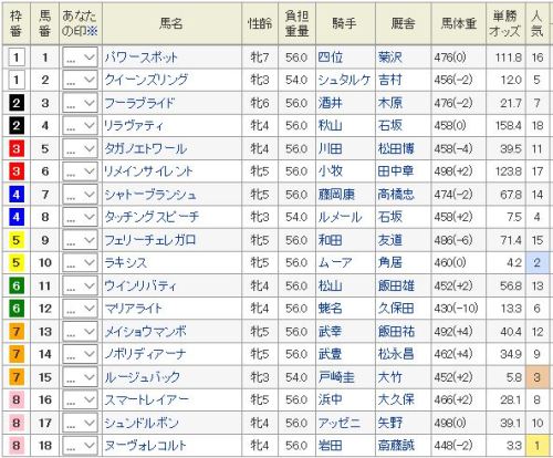 出先なので、簡単に。◎ 17 スピルバーグ〇 8 ラブリーデイ▲ 15 ショウナンパンドラ△ 9 エイシンヒカリ△ 11 ワンアンドオンリー買い目: