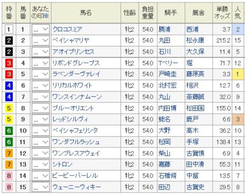 軸はかたそうで◎ 1 ラブリーデイ 充実一途〇 15 ショウナンパンドラ 距離延びて前進▲ 11 ミッキークイーン 斤量差を活かして△ 13 ヒットザターゲット 休み明けを克服すれば△ 5 ペルーサ 近走悪くない買い目: