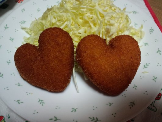 いやぁ~ん♪かわいい~~~♪って事で、買っちゃいましたぁ~~!!!一個70円のハートの形のコロッケ♪中は、ジャガイモとサツマイモ。おかずにはならないよぉ~(笑)