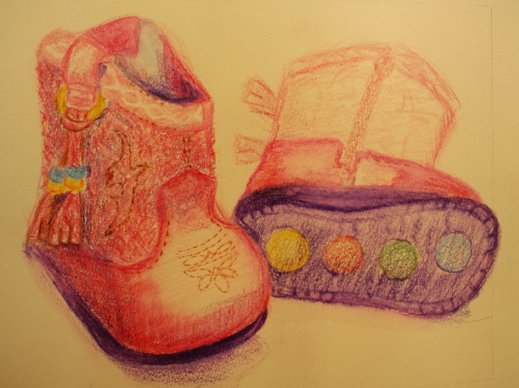 はい。混迷の度合いを深めていく色鉛筆画です。もう、私ったらせっかくの水彩色鉛筆なのに、水を使うことが少ないです。水彩色鉛筆を使う意味がなくなりつつある?では、そんなヘボ作品を・・・実際、人間の子供がはけるブーツのようです。サイズは12cm。いったい何歳の人間の子供がはけるのだろうか?と考えてしまい、そっちの方が気になって?(笑)