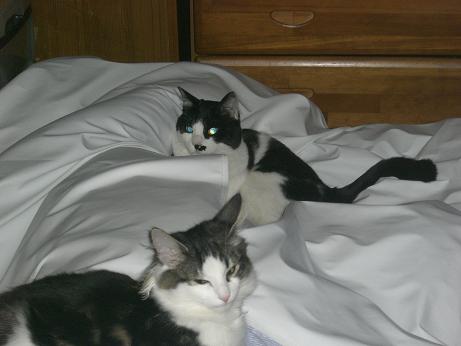 昨日の朝は、とても冷え込みました。朝、寒かったのか、めずらしくミュウが布団の中に入ってきました。そして、マーシャも...。ミュウは私の足の間、マーシャは腰のあたりで寝てました。お互いに気づかなかったのかな?たまにはこんなに近くにいることも...。(いつもマーシャは目つきが悪いな~)