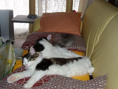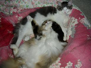 仲良くお昼寝最近はにゃんずが冬眠中でブログのネタ探しも大変だ~おっ、今がチャンス!の時にはカメラがそばになかったり...。買ったビデオカメラも動画が重すぎてアップするのが大変だったり...。いっそ私も冬眠したいよ~あ~、ダメダメ今年は少しがんばろうと自分にカツをいれたばかりじゃないか!今までの引きこもり生活ともおさらばするのよ~。ムリは禁物。でも自分の足で歩かねば今年こそ、私は生まれかわるのよ~。きゃ~、宣言しちゃったもんね。私がくじけそうになったら、皆さん、厳しいカツを入れてくださいね。あっ、やっぱり優しいカツにしてください。(おいおい...)
