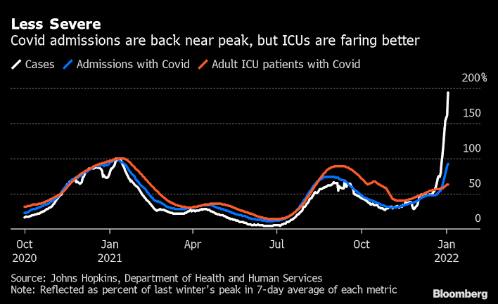 新型コロナ】全米でオミクロン感染爆発、患者殺到で病院圧迫Bloomberg News2022年1月7日 4:23 JSTオミクロン変異株は全米で爆発的に広がっており、多くの病院ではコロナ感染の入院患者が従来の最多記録に達するか、それを上回ると見込まれているコネティカット州のイェール・ニューヘブン病院では、これまでのコロナ患者の最多記録は「2020年4月の451人」だったが、「来週までにそれを超える」とみられるという。同病院で全1541床の受け入れ能力を管理するロバート・フォガティー氏が述べた米国では家庭での検査キットが不足しており、各地の当局は難しい選択を迫られているニューヨーク市の保健当局は6-7日に計250万セットを追加で受け取る予定だが 学校再開のためを検査を優先していると説明一方、フロリダ州は老人ホームなど長期介護施設での検査を優先させる方針だシカゴ市当局のウェブサイトによれば感染者が急増している同市では1月5日時点で集中治療室(ICU)の病床使用率が89%に達したICU入院患者の約3割をコロナ感染者が占めるというSource: Johns Hopkins, Department of Health and Human ServicesNote: Reflected as percent of last winter's peak in 7-day average of each metric世界保健機関(WHO)のテドロス事務局長はオミクロン変異株は感染しても従来株より重症度は低いように見えるが、軽度と考えるべきではないと指摘ジュネーブで行った記者会見で同氏は「オミクロン株は人々を入院させ、命を奪っている」と述べたベルギーでは1月中旬までに新規感染者が4倍に増える恐れがあるが、医療機関はICUを十分に確保できるはずだとの見方を専門家が示したポルトガルのコスタ首相は、学校は予定通り1月10日から再開されるが、ナイトクラブはさらに1週間閉鎖されると発表。在宅勤務は14日まで義務づけられ、それ以降も推奨されるとしたドイツのリントナー財務相は、今後数週間でオミクロン株の感染が「劇的に増加」しても、全面的なロックダウン(都市封鎖)は回避可能だとの見方を示した全豪オープンテニス出場のためオーストラリアに到着したノバク・ジョコビッチ選手が入国を拒否された問題で、同選手の弁護士らは、入国拒否の決定に法的異議を申し立てたジョンズ・ホプキンズ大学とブルームバーグの集計データによると、世界の新型コロナ感染者数は2億9800万人、死者数は546万人をそれぞれ上回ったブルームバーグのワクチントラッカーによれば、世界のワクチン接種は計93億5000万回を超えた 原題:Omicron Patients Pack U.S. Hospitals, Risking Peak Beyond 2020’s、NYC to Test Pupils; Florida Gives Seniors Priority: Virus Update(抜粋)🌟超📰黒星★新聞社☆Group