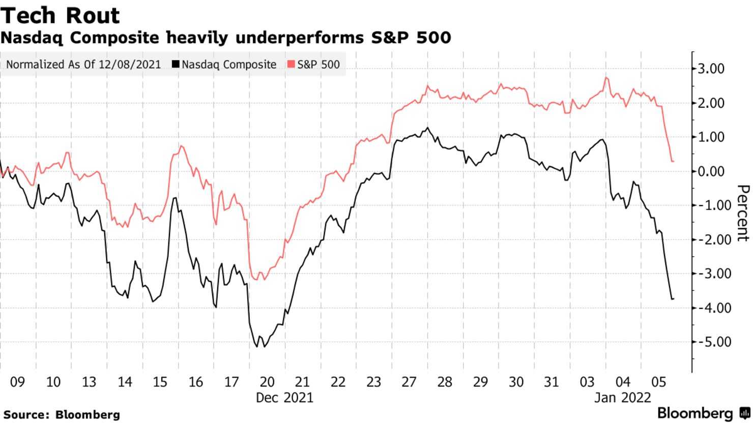 Nasdaqで💲1兆💭消失、不安定な2022年の前兆Thyagaraju Adinarayan2022年1月6日 22:18 JST➡️割高なテクノロジーが下げ主導、米10年債利回りは10カ月ぶり高水準 ➡️高成長銘柄に集中投資のアーク・イノベーションETFは今週9%安 ナスダック総合指数は米国債利回りの急上昇が投資家を驚かせた今週、時価総額にして約1兆ドル(約116兆円)を失った。2022年の相場が不安定になるとの予想を強めた割高なソフトウエアメーカーやバイオテクノロジー株が売られ、高成長銘柄への集中投資で知られるキャシー・ウッド氏の上場投資信託(ETF)、アーク・イノベーションETFは9%下落した10年物米国債利回りは約10カ月ぶり高水準の1.75%付近で推移している。金利上昇は将来の利益の現在価値を低下させるため、割高な高成長銘柄の重しになるゼットスケーラー、データドッグ、ペロトン・インタラクティブ、クラウドストライク・ホールディングスは今週いずれも10-18%下落した大手テクノロジー株も下落を免れず、NYSE・FANG+指数は2.8%下げた。エヌビディアとマイクロソフトの下げが特に大きいデューテリウム・キャピタル・マネジメントのグローバルアセットアロケーション責任者、ジョン・リシャルディ氏は、1-3月(第1四半期)はアップルやマイクロソフトなどの時価総額を世界最大に押し上げたテクノロジーセクターのバリュエーションブームが少なくとも一時的に反転するだろう」と述べた21年よりもリターンは低くボラティリティーが高くなるダロウとの見方🌟超📰黒星★新聞社☆Group